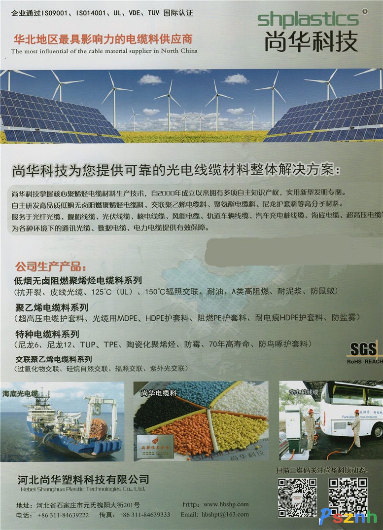 河北尚華塑料科技有限公司 電纜料 聚烯烴阻燃電纜料 交聯(lián)聚乙烯電纜料 改性彈性體電纜料點擊:1276 查看原圖![]() ![]() ![]() 河北尚華塑料科技有限公司