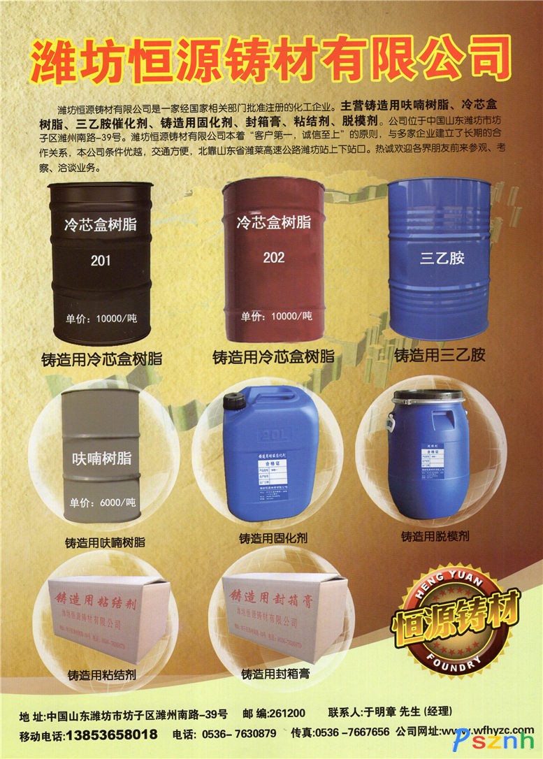 濰坊恒源鑄材有限公司 冷芯盒樹脂、三乙胺催化劑、呋喃樹脂、磺酸固化劑、點擊:1877 查看原圖![]() ![]() ![]() 濰坊恒源鑄材有限公司