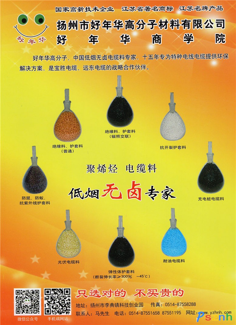 低煙低鹵_電纜料-揚州市好年華高分子材料有限公司點擊:793 查看原圖![]() ![]() ![]() 公司名稱:揚州市好年華高分子材料有限公司