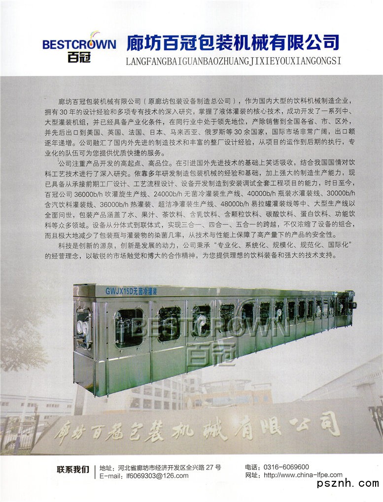 廊坊百冠包裝機(jī)械有限公司 超潔凈系統(tǒng) 熱灌裝純汁生產(chǎn)線 飲用水5L大瓶水點(diǎn)擊:530 查看原圖![]() ![]() ![]() 地址:河北廊坊經(jīng)濟(jì)開發(fā)區(qū)全興路27號(hào)