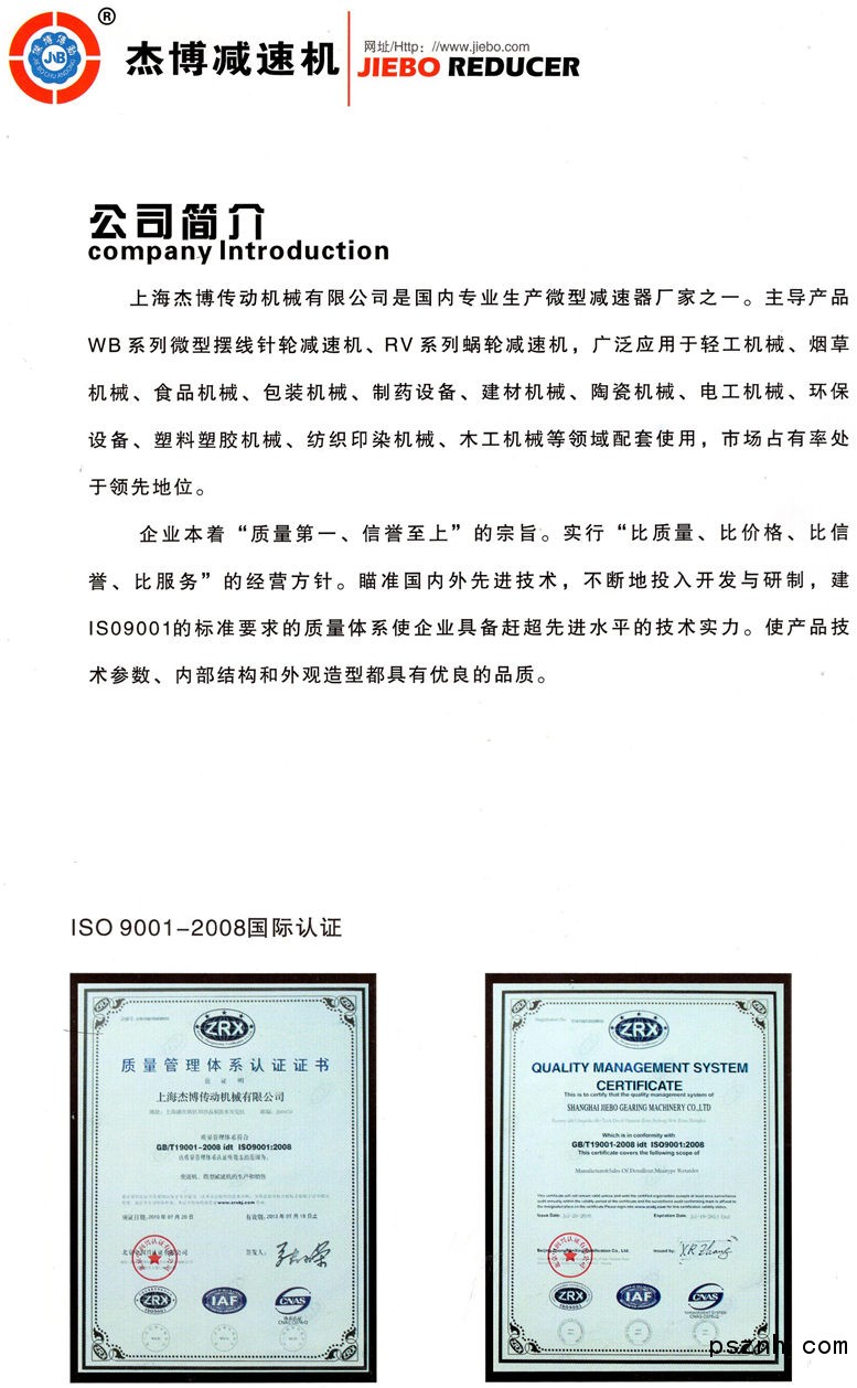 上海杰博傳動機械有限公司 擺線減速機 WB系列微型擺線針輪減速機 MB系列行星錐盤無級 變速機點擊:707 查看原圖![]() ![]() ![]() 公司地址:上海市西藏北路571號518室