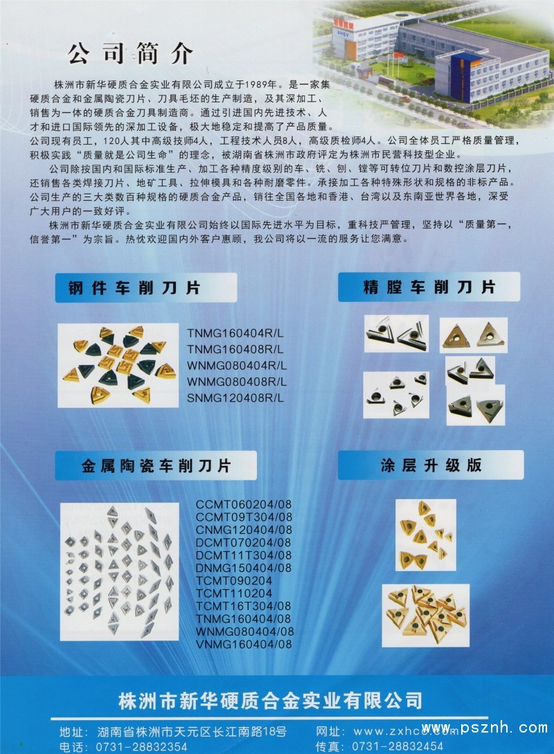株洲市新華硬質(zhì)合金實(shí)業(yè)有限公司 鋁用刀片 金屬陶瓷刀片 車(chē)削刀片 銑削刀片 焊接刀片點(diǎn)擊:1452 查看原圖![]() ![]() ![]() 地址: 中國(guó)湖南省株洲市天元區(qū)長(zhǎng)江南路18號(hào)