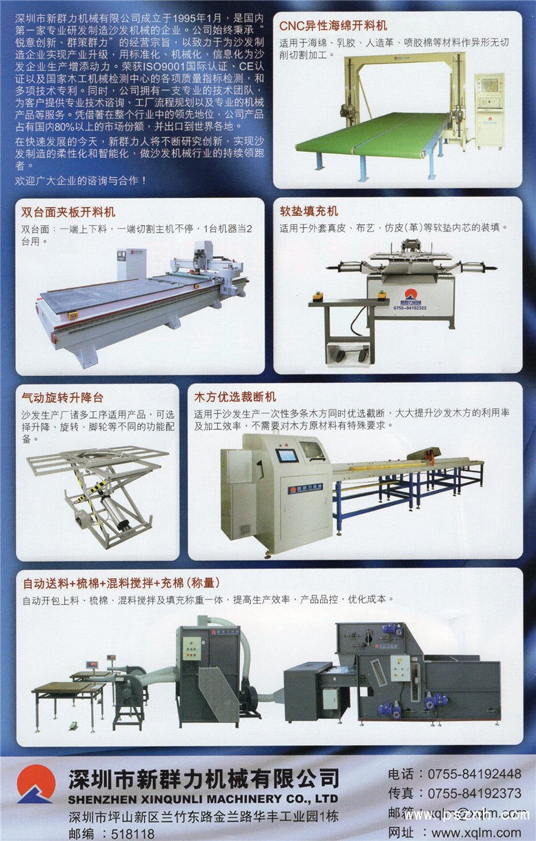 深圳市新群力機(jī)械有限公司 沙發(fā)木工加工機(jī)械 沙發(fā)海綿切割機(jī)械 沙發(fā)輔助加工機(jī)械點(diǎn)擊:605 查看原圖![]() ![]() ![]() TEL: 86-755-84192323