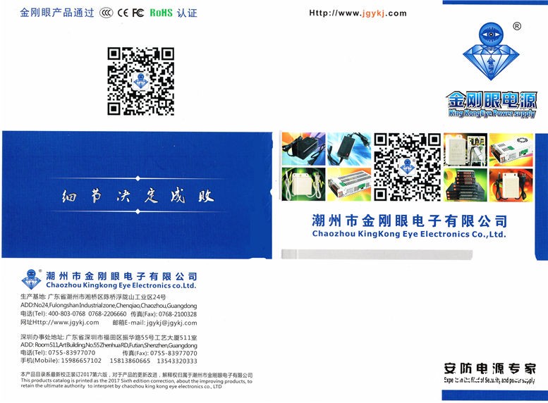 | 公司簡介: | 潮州市金剛眼電子有限公司前身潮州市金剛眼電子廠,成立于2001年.公司是一家專業(yè)從事安防電源、LED電源、視頻分配器的制造廠家,集研發(fā)、生產(chǎn)、銷售于一體。公司主要為安防市場提供優(yōu)質(zhì)的防水電源、網(wǎng)狀電源、監(jiān)控電源和POE電源、POE交換機等。迄今公司產(chǎn)品已通過了3C認(rèn)證,CE認(rèn)證,F(xiàn)CC認(rèn)證,ROSH認(rèn)證,并于2014年度被評為“廣東省重合同守信用企業(yè)”榮譽稱號。