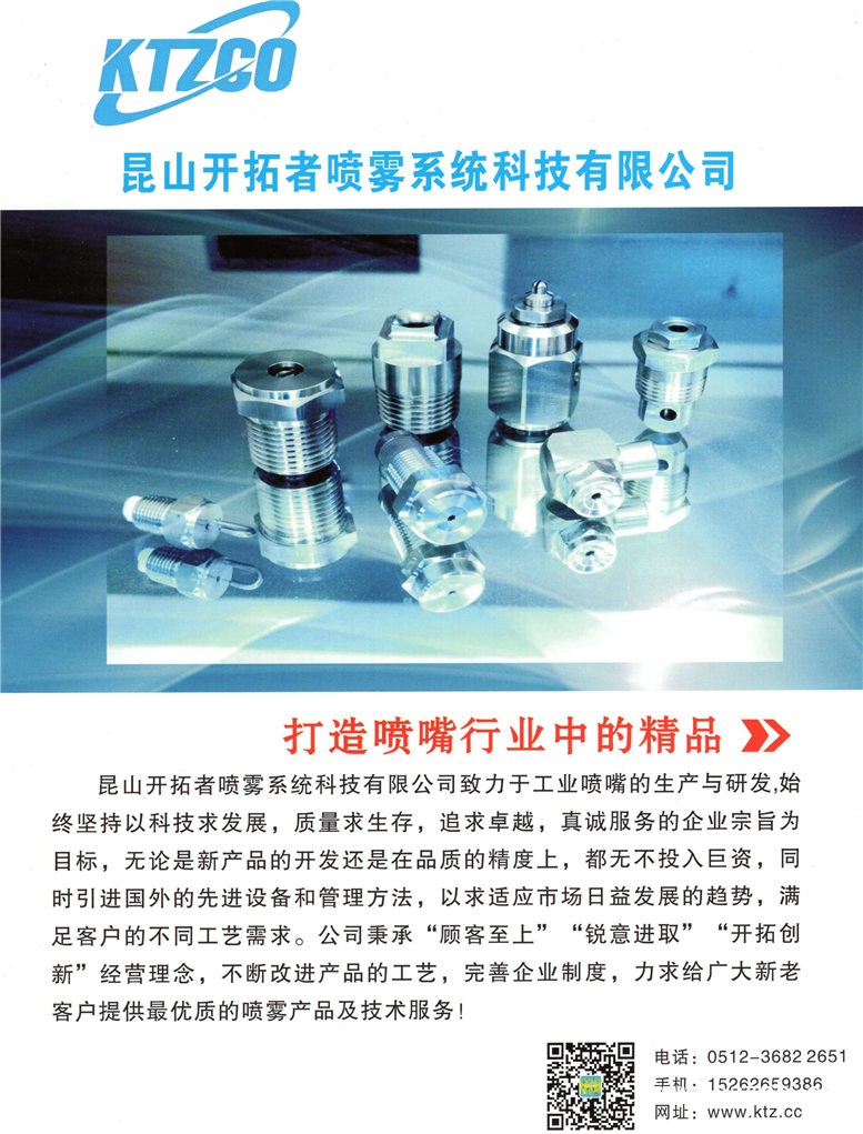 | 公司簡介: | 昆山開拓者噴霧系統(tǒng)科技有限公司 十多年來全心致力于工業(yè)噴嘴的研究與生產(chǎn),無論是在新產(chǎn)品的開發(fā),還是在品質(zhì)的精度上,都不遺余力地投下巨額資金及人力,雖然現(xiàn)今產(chǎn)品種類多達20000種以上,但是我們依然秉持著創(chuàng)新及服務(wù)的精神,持續(xù)以高科技的流體力學(xué)技術(shù),研發(fā)最先進的噴霧產(chǎn)品,協(xié)助產(chǎn)業(yè)升級改善制程能力。 ![]() 噴嘴看似簡單,實際上是流體力學(xué)的高度專業(yè)應(yīng)用,絕非一般的機械加工可以取代的,噴嘴必須經(jīng)過專業(yè)的設(shè)計,精良的加工,以及高精密儀器的測試才能達到最理想的噴霧效果,在眾多領(lǐng)域中,噴嘴扮演著重要角色。 由于越來越激烈的市場競爭,客戶對產(chǎn)品的性價比也提出了更高的要求,促使生產(chǎn)廠家不斷改善產(chǎn)品生產(chǎn)工藝,開拓者噴嘴技術(shù)可以幫助您改進生產(chǎn)工藝,助你提高生產(chǎn)率。更重要的是我們從項目計劃階段就可以為你提供噴嘴的主要參數(shù),以保證您工藝的順利進行。我們能夠根據(jù)客戶不同要求提供相應(yīng)的系統(tǒng)解決方案。 聯(lián)系人:周歡(152-6265-9386) 電話:0512-36822651