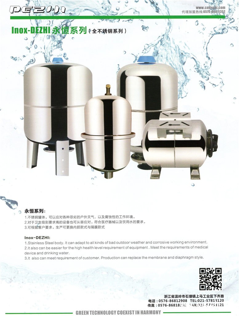 | 公司簡介: | 臺州天揚機電有限公司 位于浙江省臺州市溫嶺石塘上馬工業(yè)區(qū),占地面積15000平方米。![]() 公司擁有超過30年的模具設(shè)計和開發(fā)的經(jīng)驗,“德志”和 “AQUALEADER”是我們公司的專有品牌。我們對壓力罐有20年的生產(chǎn)經(jīng)驗,產(chǎn)品型號全面,從0.5L到1500L,工作壓力從4bar到25bar。產(chǎn)品適用于熱泵系統(tǒng),供熱系統(tǒng),鍋爐系統(tǒng),高太陽能系統(tǒng)和消防系統(tǒng)。并且遠銷到歐洲,東南亞,北美,南美,中東等。我們可以設(shè)計,也可以根據(jù)客戶提供的樣品或圖紙加以生產(chǎn)和加工產(chǎn)品。 我們始終堅持的經(jīng)營理念“信譽第一,高品質(zhì)的產(chǎn)品,最好的服務(wù)”。以科學(xué)的管理,立足國內(nèi),面向世界,歡迎國內(nèi)和國外客戶來我司參觀洽談。 我們真誠希望合作,共同發(fā)展,共同創(chuàng)造一個美好的未來。 臺州天揚機電有限公司永遠是您最忠實的伙伴。 聯(lián)系人:連先生