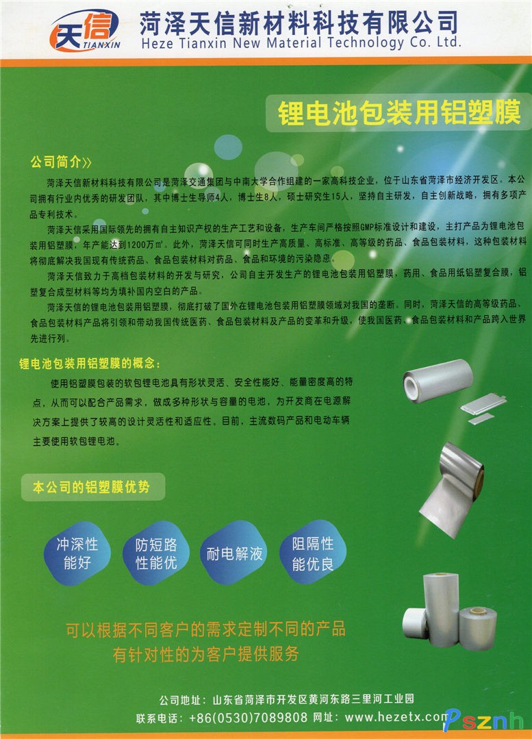 菏澤天信新材料科技有限公司_鋰電池包裝_藥品包裝_食品包裝_農(nóng)藥包裝點擊:765 查看原圖![]() ![]() ![]() 菏澤天信新材料科技有限公司