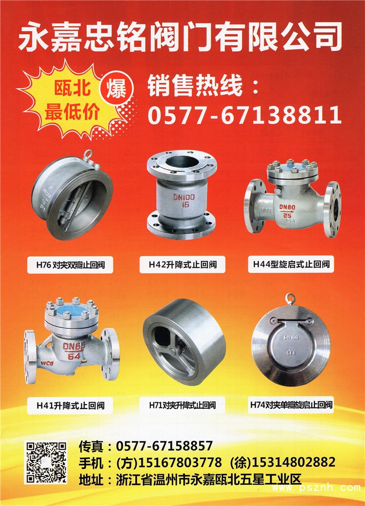 永嘉縣忠銘閥門有限公司 旋啟止回閥 對夾止回閥 升降式止回閥點擊:667 查看原圖![]() ![]() ![]() 永嘉縣忠銘閥門有限公司: