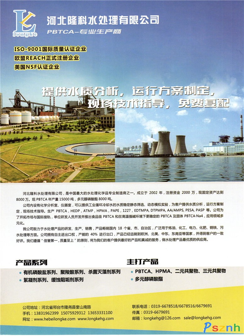 | 經(jīng)營(yíng)范圍: | 工業(yè)循環(huán)冷卻水處理、工業(yè)污水、城市生活污水處理;2-膦酸基-1,2,4-三羧基丁烷銷售及本企業(yè)相關(guān)的產(chǎn)品的出口業(yè)務(wù)(國(guó)家限定公司經(jīng)營(yíng)或出口的商品及技術(shù)除外)。(依法須經(jīng)批準(zhǔn)的項(xiàng)目,經(jīng)相關(guān)部門(mén)批準(zhǔn)后方可開(kāi)展經(jīng)營(yíng)活動(dòng)) | ||
