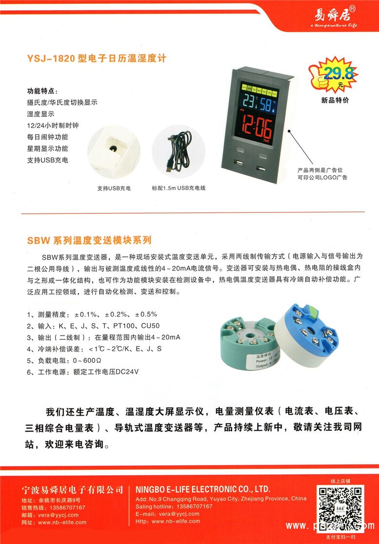寧波易舜居電子有限公司 電子溫濕度計 電子定時器 電流電壓儀表 溫度變送器點擊:1073 查看原圖![]() ![]() ![]() 銷售熱線: 13586707167