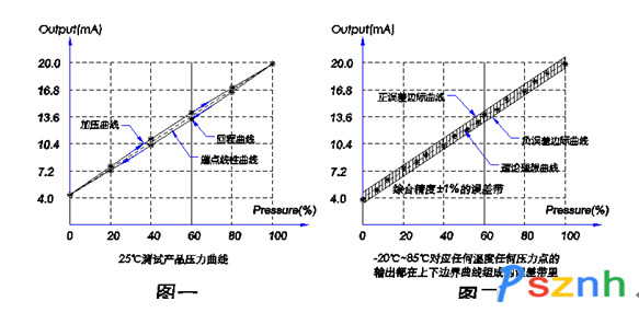 說(shuō)到壓力傳感器及變送器的穩(wěn)定性就必須說(shuō)說(shuō)另一個(gè)重要指標(biāo)———精度。精度這個(gè)概念,個(gè)人認(rèn)為有兩個(gè)概念需要明確下:一個(gè)是線性精度,另一個(gè)是綜合精度(Total Error Band)。所謂線性精度是指:將零點(diǎn)的輸出值和滿度的輸出值看做一條直線,壓力過(guò)程中的任何一個(gè)點(diǎn)的輸出相對(duì)這條直線對(duì)應(yīng)輸出的偏差值占滿量程(即跨度)輸出的百分比,線性精度包括非線性, 遲滯及重復(fù)性。線性精度是一個(gè)在實(shí)驗(yàn)室常(25℃±2℃)溫測(cè)得的技術(shù)指標(biāo)(見(jiàn)圖一)。所謂