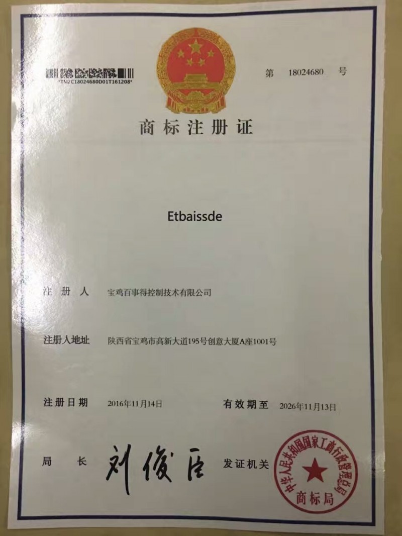 熱烈祝賀歷時一年半寶雞百事得控制技術(shù)有限公司申請注冊的“Etbaissde”商標(biāo),獲得中華人民共和國國家工商行政管理總局商標(biāo)局核準(zhǔn)注冊成功。