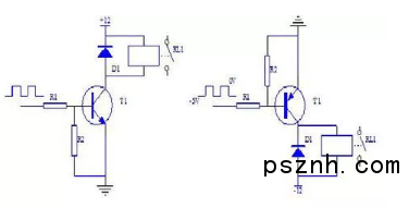 1、晶體管用來驅(qū)動繼電器,必須將晶體管的發(fā)射極接地。具體電路如下:NPN晶體管 PNP晶體管 NPN晶體管驅(qū)動時:當晶體管T1基極被輸入高電平時,晶體管飽和導通,集電極變?yōu)榈碗娖剑虼死^電器線圈通電,觸點RL1吸合。當晶體管T1基極被輸入低電平時,晶體管截止,繼電器線圈斷電,觸點RL1斷開。PNP晶體管驅(qū)動電路目前沒有采用,因此在這里不作介紹。1.2 電路中各元器件的作用:晶體管T1可視為控制開關,一般選取VCBO≈VCEO≥24V,放大倍數(shù)β一般選擇在120~240之間。。電阻R1主要起限流作用,降低晶體管T1功耗,阻值為2 KΩ。電阻R2使晶體管T1可靠截止,阻值為5.1KΩ。二極管D1反向續(xù)流,抑制浪涌,一般選1N4148即可。 2 集成電路2003驅(qū)動繼電器左圖1~7是信號輸入(IN),10~16是輸出信號(OUT),8和9是集成電路電源。右圖是集成塊內(nèi)部原理圖。