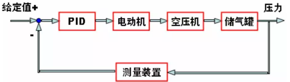 通過壓力變送器測得的管網(wǎng)壓力值與壓力的設(shè)定值相比較,得到偏差,經(jīng)PID調(diào)節(jié)器計算出節(jié)電器作用于異步電動機(jī)的頻率值。由節(jié)電器輸出的相應(yīng)頻率和幅值的交流電,使電動機(jī)上得到相應(yīng)的轉(zhuǎn)速。那么空壓機(jī)輸出相應(yīng)的壓縮空氣至儲氣罐,使之壓力變化,直到管網(wǎng)壓力與給定壓力值相同。
