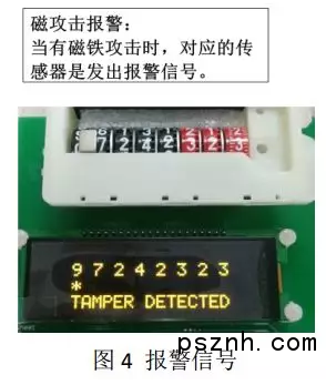 通過內(nèi)部算法,可以實(shí)現(xiàn)流量計(jì)的報警功能,即顯示“ Tamper detected”,如圖 4 所示。當(dāng)有一個磁鐵靠近字輪或者傳感器時,傳感器模擬輸出電壓會超出正常范圍。通過設(shè)定閾值,可以實(shí)現(xiàn)“正常運(yùn)行”還是“收到攻擊”的判斷。當(dāng)外加磁場消失后,系統(tǒng)會自動恢復(fù)到正常運(yùn)行的狀態(tài),即顯示“ Status normal”。