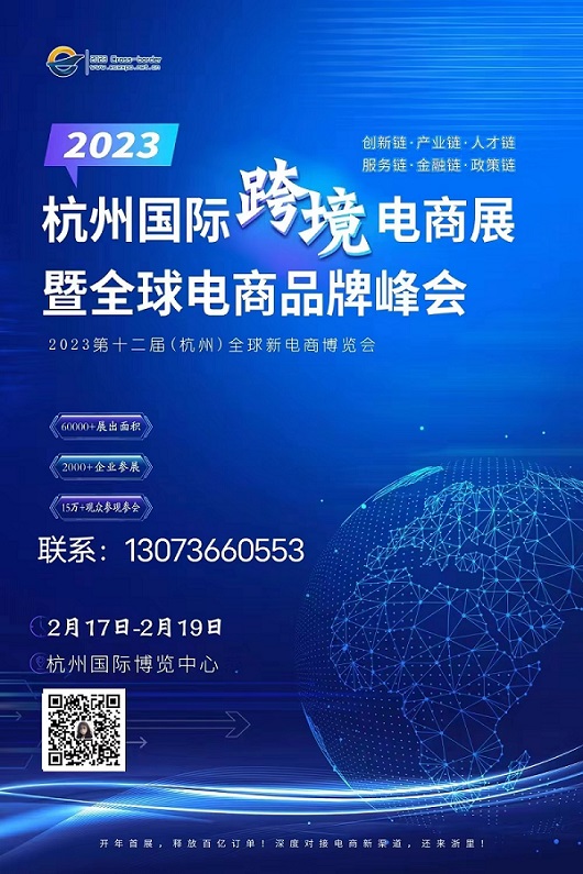 2023杭州國(guó)際跨境電商展暨全球電商品牌峰會(huì)將于2023年2月17日-19日在杭州國(guó)際博覽中心舉辦。近60000平展出面積,預(yù)計(jì)2000家企業(yè)參展,15萬(wàn)觀眾參觀參會(huì)。我們將繼續(xù)不遺余力的加大宣傳推廣力度,秉承“育品牌展會(huì),創(chuàng)一流服務(wù)”的辦展理念,積極整合國(guó)內(nèi)外行業(yè)資源,邀請(qǐng)相關(guān)政府部門(mén)領(lǐng)導(dǎo)作跨境電商政策解讀,知名電商企業(yè)高管對(duì)市場(chǎng)發(fā)展趨勢(shì)進(jìn)行分享,專家學(xué)者就行業(yè)發(fā)展趨勢(shì)進(jìn)行預(yù)測(cè)及分析;國(guó)內(nèi)外電商賣(mài)家與品牌商之間面對(duì)面洽談,開(kāi)展企業(yè)品牌對(duì)接交流會(huì)和項(xiàng)目推介會(huì)。全網(wǎng)宣傳,5000社群不間斷推送展會(huì)訊息,全網(wǎng)鏈接1000個(gè)關(guān)鍵詞搜索,招展團(tuán)隊(duì)實(shí)時(shí)邀約觀眾,30萬(wàn)數(shù)據(jù)庫(kù)精準(zhǔn)投遞,30多家合作媒體,展會(huì)覆蓋整個(gè)新電商產(chǎn)業(yè)帶。