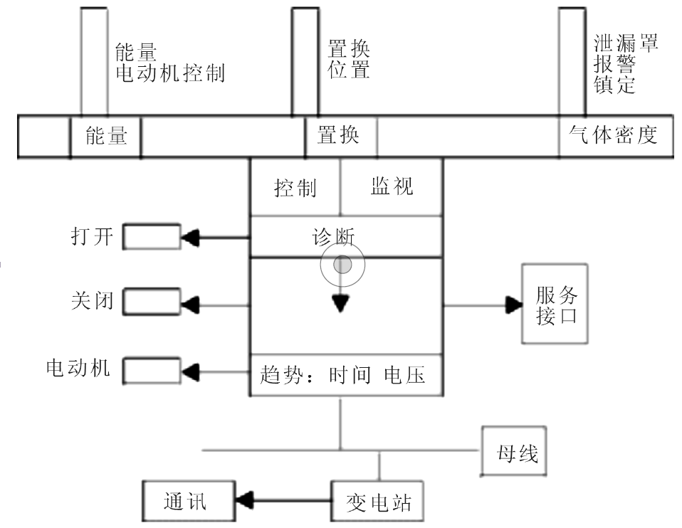 圖1概要說明了一種兼有計(jì)算機(jī)系統(tǒng)和傳感裝置的智能化斷路器工作原理。主要的傳感器可探明氣體密度,通過監(jiān)控其運(yùn)動(dòng)和能量變化,反映操作機(jī)構(gòu)狀態(tài)。氣體密度傳感器發(fā)出的信號(hào)能夠?qū)崿F(xiàn)連續(xù)的狀態(tài)監(jiān)測(cè),確定趨勢(shì)走向以及檢測(cè)極限值,并能在此基礎(chǔ)上實(shí)現(xiàn)常規(guī)的SF6氣體的鎖定和報(bào)警功能。同樣,在運(yùn)動(dòng)傳感器和能量傳感器的幫助下,操作機(jī)構(gòu)的狀態(tài)可實(shí)現(xiàn)監(jiān)控。另外,這些傳感器的信號(hào)可同時(shí)用于常規(guī)的位置指示和電動(dòng)機(jī)控制功能上。