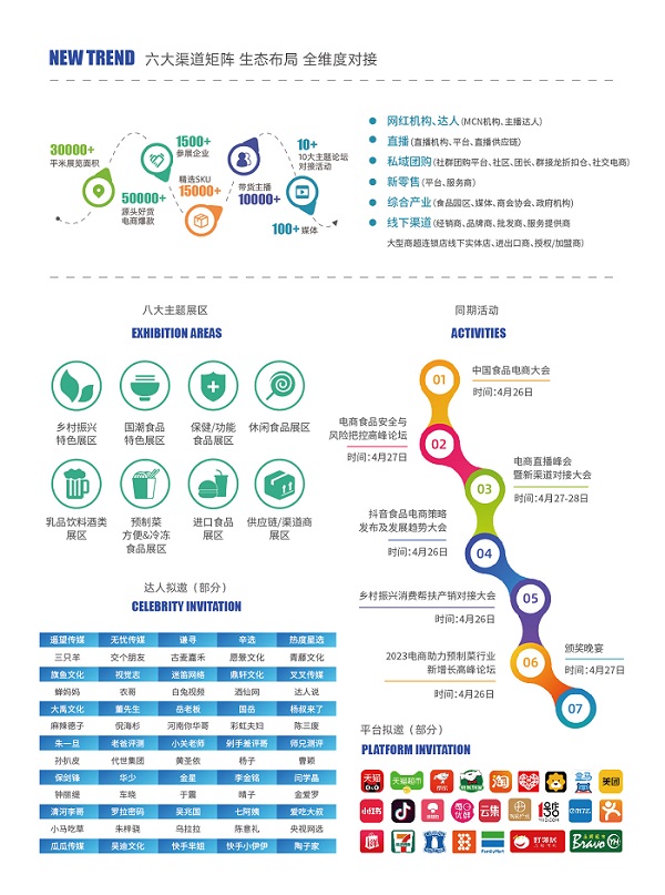 目的: 本次博覽會(huì)以【與“食”俱進(jìn)·共鏈共生】為主題,現(xiàn)場(chǎng)超40000㎡面積,通過(guò)“主題論壇+行業(yè)交流+展覽展示+渠道選品”等形式,在品牌展示、科技合作、行業(yè)分享、產(chǎn)品交易等方面打造食品電商產(chǎn)業(yè)綜合服務(wù)交流平臺(tái)。