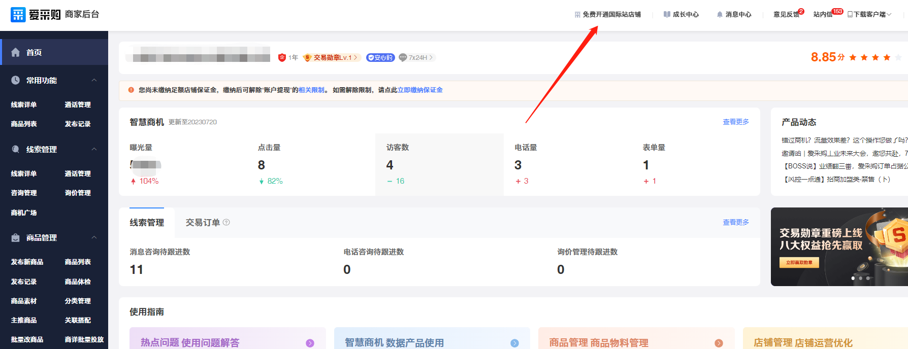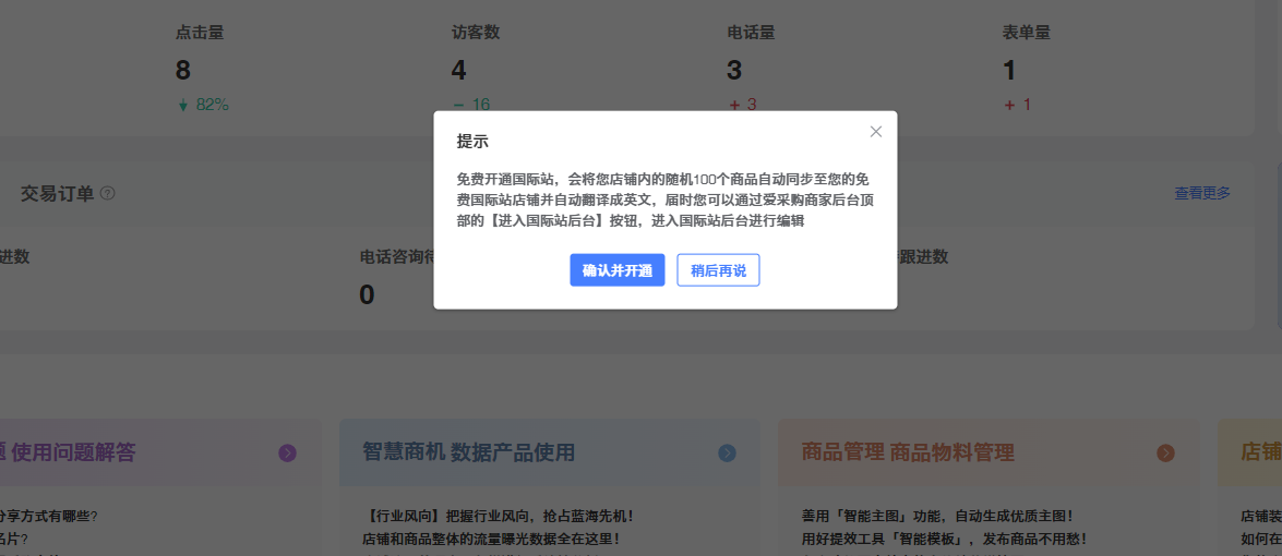 第二步:進(jìn)入后臺(tái)首頁(yè)以后,點(diǎn)擊“免費(fèi)開通國(guó)際站店鋪”