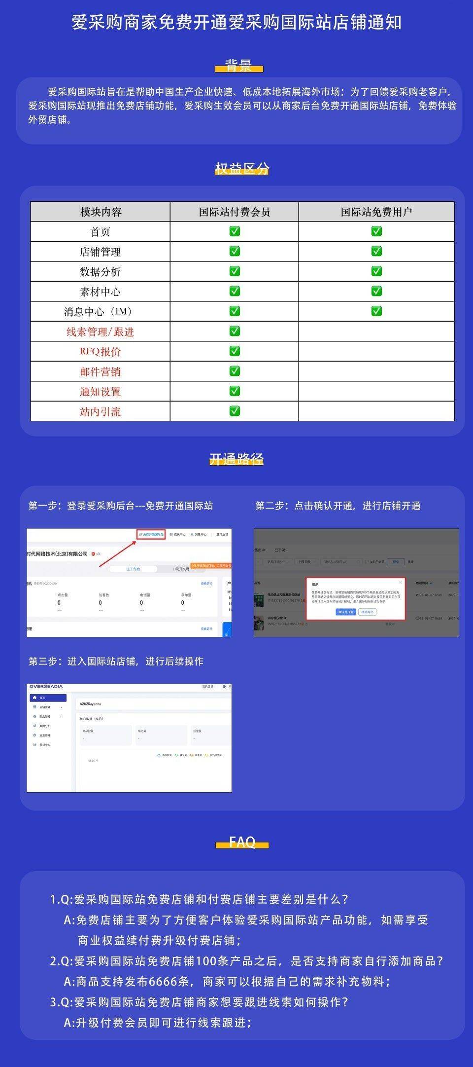 1. 免費(fèi)開(kāi)通:只限已開(kāi)通愛(ài)采購(gòu)店鋪會(huì)員的企業(yè),沒(méi)有開(kāi)通國(guó)內(nèi)愛(ài)采購(gòu)的企業(yè)需要開(kāi)通國(guó)內(nèi)愛(ài)采購(gòu),開(kāi)戶(hù)是6980元/年。免費(fèi)開(kāi)通的權(quán)益包括發(fā)布產(chǎn)品信息、展示企業(yè)信息、與海外買(mǎi)家進(jìn)行溝通等基本功能,使企業(yè)可以獲得基本的曝光和推廣。