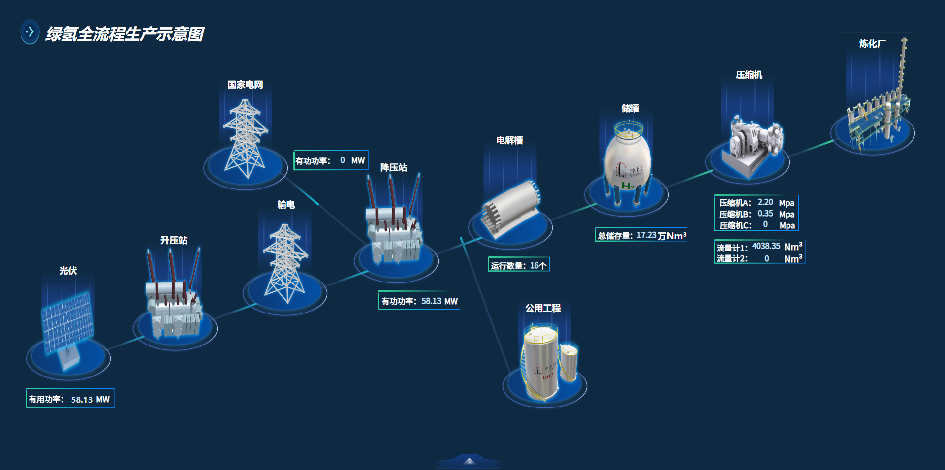 通過全生命周期的仿真智慧模擬驗(yàn)證,系統(tǒng)滿足項(xiàng)目對(duì)光伏波動(dòng)的自動(dòng)快速響應(yīng)需求,優(yōu)選用電策略、開槽策略及源網(wǎng)荷儲(chǔ)用控制策略。依據(jù)現(xiàn)場(chǎng)工藝設(shè)備情況,實(shí)現(xiàn)全過程的自感知、自診斷、自學(xué)習(xí)、自尋優(yōu)、自適應(yīng)極端天氣變化及用氫變化,達(dá)成一鍵啟停、全自動(dòng)無人操作的功能。