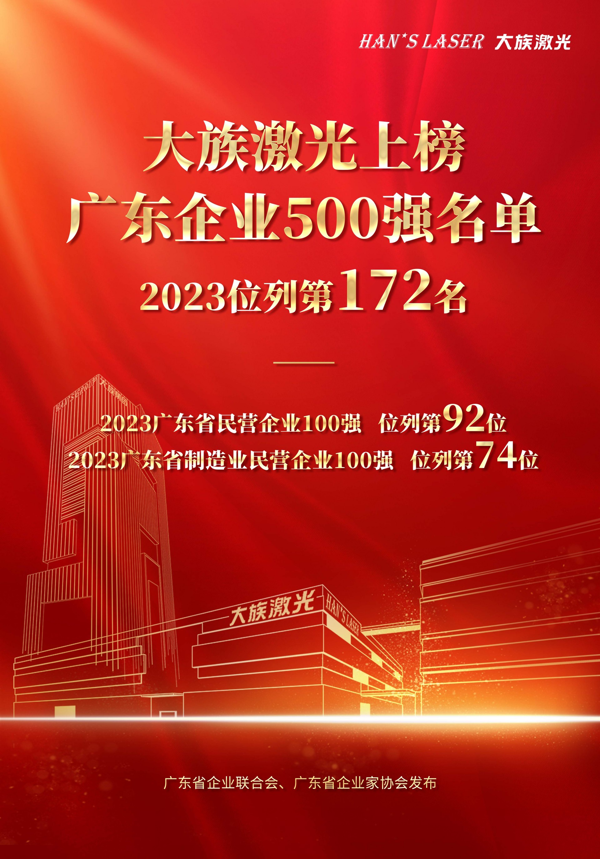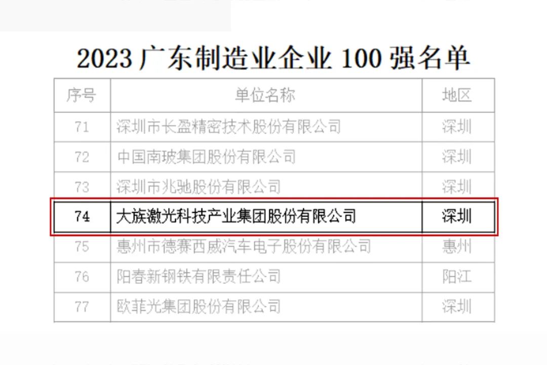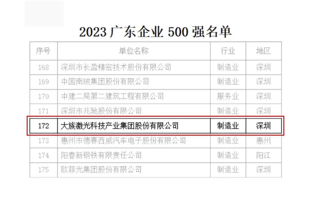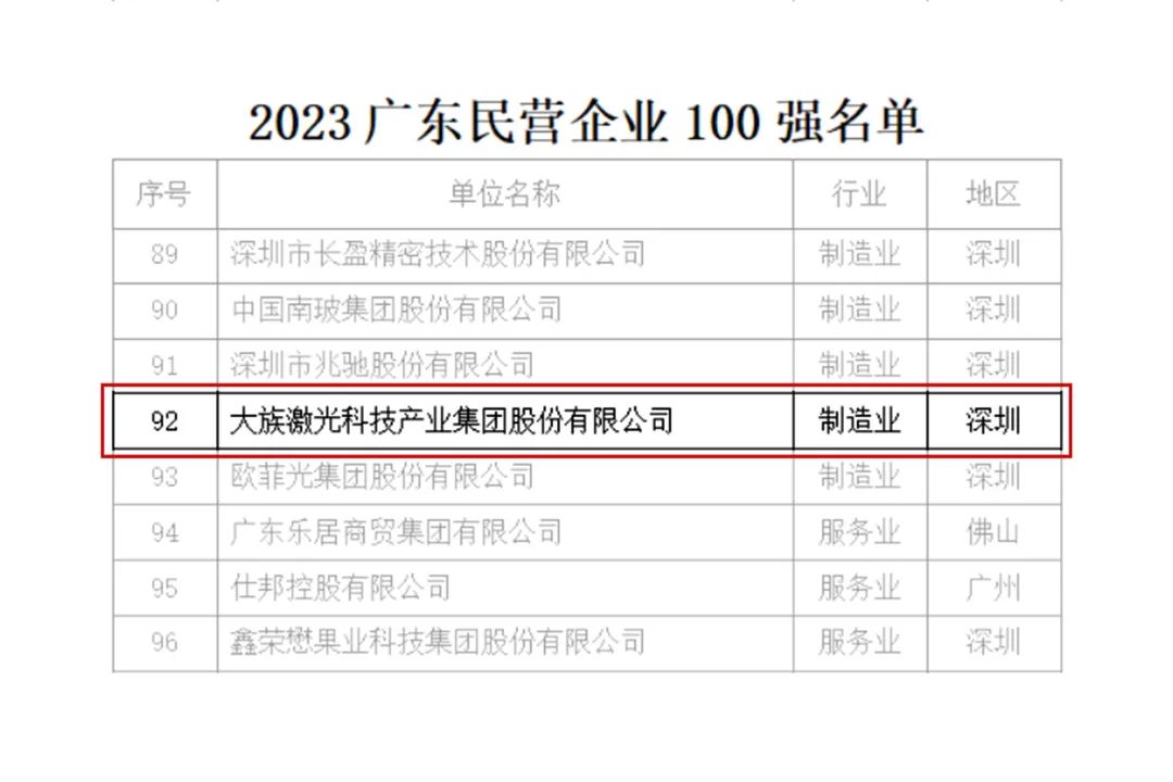 近日,廣東省企業(yè)聯(lián)合會(huì)、廣東省企業(yè)家協(xié)會(huì)在廣州舉辦2023廣東500強(qiáng)企業(yè)發(fā)展大會(huì),此次大會(huì)以“強(qiáng)化龍頭引領(lǐng),推動(dòng)產(chǎn)業(yè)升級(jí)”為主題,正式發(fā)布2023廣東企業(yè)500強(qiáng)榜單。大族激光憑借雄厚的綜合實(shí)力和穩(wěn)健表現(xiàn),入圍廣東企業(yè)500強(qiáng),同時(shí)上榜2023廣東省民營企業(yè)100強(qiáng)和2023廣東省制造業(yè)民營企業(yè)100強(qiáng),分別位列92名、74名。