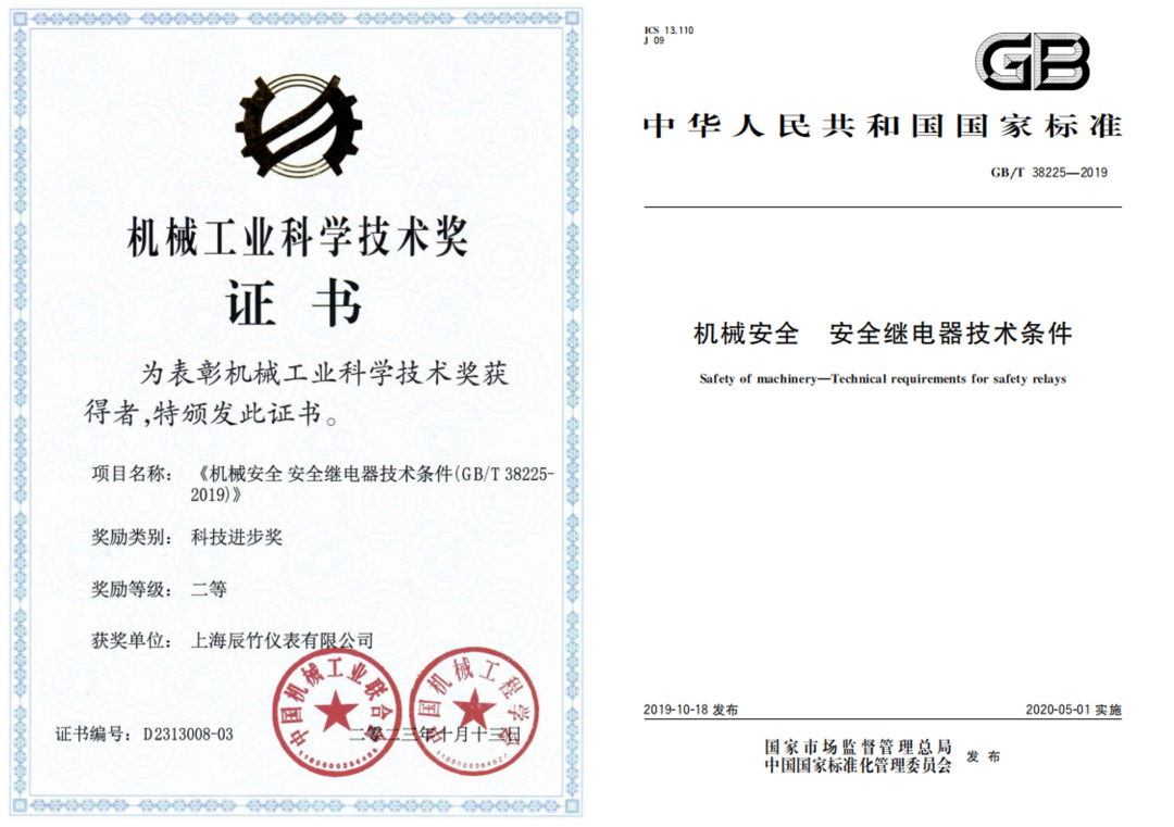 機(jī)械安全 安全繼電器技術(shù)條件 (GB/T 38225-2019)》榮獲中國機(jī)械工業(yè)聯(lián)合會、中國機(jī)械工程學(xué)會授予的機(jī)械工業(yè)科學(xué)技術(shù)二等獎(jiǎng),即是對這一國家標(biāo)準(zhǔn)提高國內(nèi)安全繼電器的設(shè)計(jì)水平和質(zhì)量的肯定,也是對其促進(jìn)國內(nèi)制造商在安全繼電器領(lǐng)域的研發(fā)與發(fā)展給予的鼓勵(lì),上海辰竹將繼續(xù)在安全繼電器與安全控制回路領(lǐng)域深耕,堅(jiān)持技術(shù)創(chuàng)新,不斷用優(yōu)質(zhì)的產(chǎn)品讓自動化更安全!