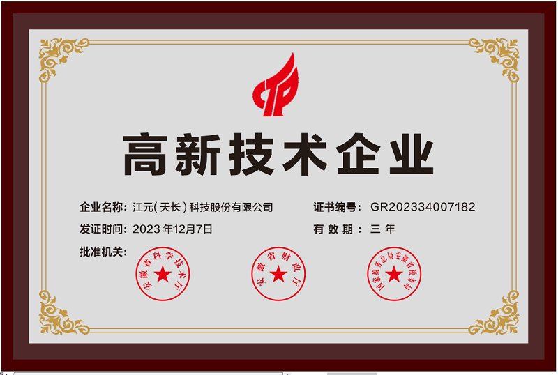 江元(天長)公司喜獲國家級高新技術企業(yè)認證