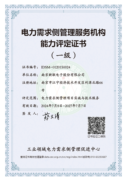 近日,南京新聯(lián)電子股份有限公司順利通過工業(yè)領(lǐng)域電力需求側(cè)管理促進中心能力評估審核,公司電力需求側(cè)管理服務(wù)機構(gòu)能力評定證書(一級)成功換證,這是對新聯(lián)電子在電力需求側(cè)領(lǐng)域服務(wù)能力和技術(shù)實力的充分肯定。