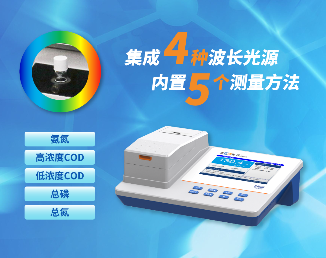 集成4種波長光源,內(nèi)置氨氮、高濃度COD、低濃度COD、總磷、總氮5個測量方法