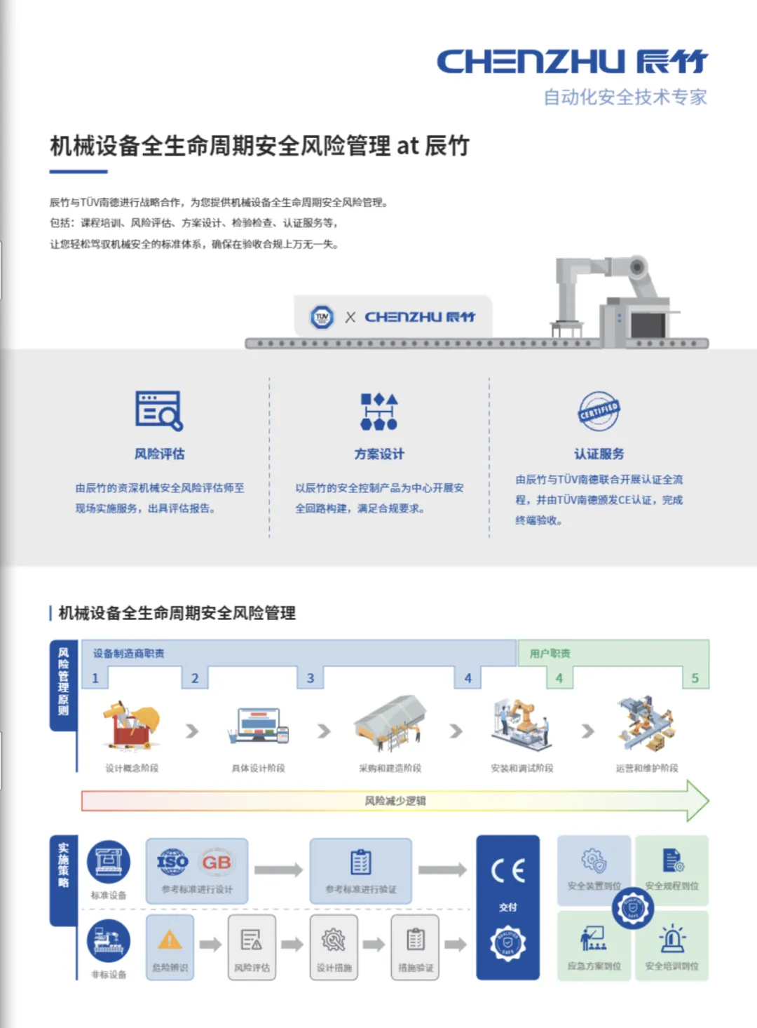 針對用戶需要解決的本質(zhì)問題,我們提出了“機(jī)械設(shè)備全生命周期安全風(fēng)險管理 at 辰竹”的主題,以CMRE為抓手,為用戶提供風(fēng)險評估、方案設(shè)計與認(rèn)證服務(wù),幫助用戶輕松駕馭機(jī)械安全的標(biāo)準(zhǔn)體系,確保在驗收合規(guī)上萬無一失