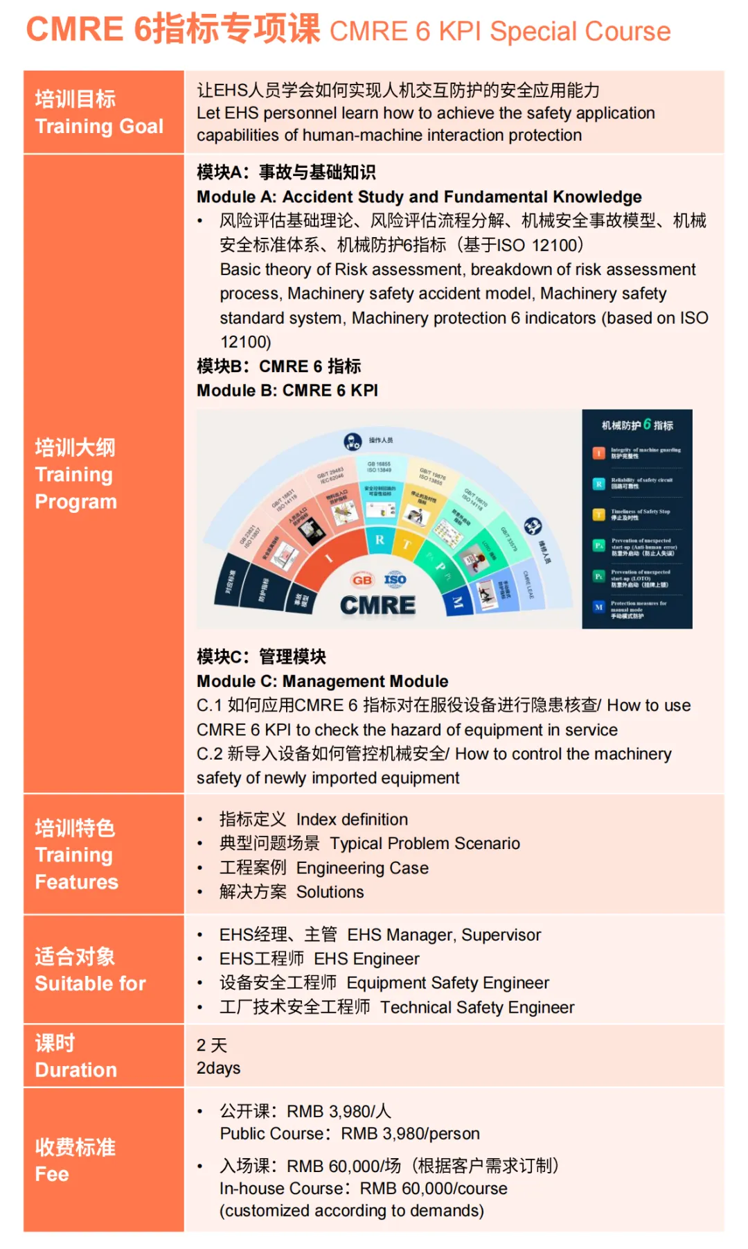 11月7~8日,在上海辰竹的CMRE培訓(xùn)中心,第二屆CMRE 6指標(biāo)專項課又將啟動了。課程以“讓EHS人員學(xué)會如何實現(xiàn)人機(jī)交互防護(hù)的安全應(yīng)用能力”為目標(biāo),通過創(chuàng)新性地將六大機(jī)械防護(hù)指標(biāo)與機(jī)械設(shè)備安全知識體系思維框架模型相結(jié)合,并輔以專業(yè)的產(chǎn)品、培訓(xùn)以及軟件服務(wù),來幫助學(xué)員一站式解決機(jī)械安全的各類問題。