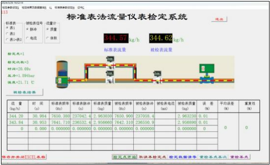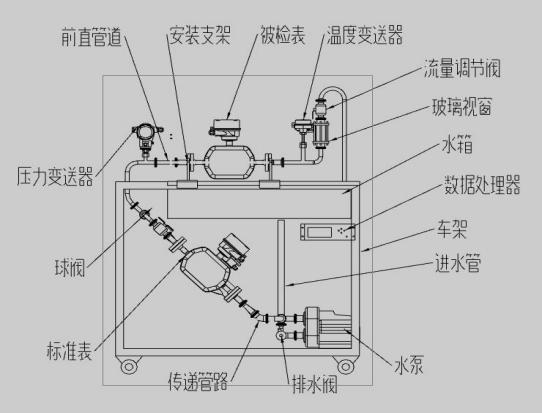 該裝置基于流體連續(xù)流原理,以標準表(如渦輪流量計、渦街流量計、電磁流量計、容積式流量計、科里奧利質量流量計等)為主標準器,在相同時間間隔內流體連續(xù)通過標準表和被檢流量計,通過比較兩者的輸出流量值,確定被檢流量計的計量性能。根據(jù)液體不可壓縮的原理,在同一管道中任何時刻不同截面處的流量均相等,通過精確測量標準表與被檢表的脈沖信號計數(shù)及標準表的儀表系數(shù),利用特定公式計算得出被檢表的儀表系數(shù),從而實現(xiàn)對被檢流量計的標定。