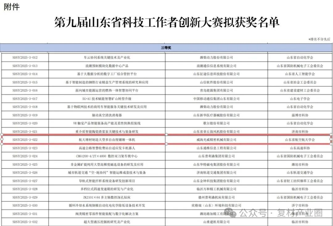 近日,在山東省科學(xué)技術(shù)協(xié)會(huì)、?山東省總工會(huì)主辦的第九屆山東省科技工作者創(chuàng)新大賽上,威海光威精密機(jī)械有限公司申報(bào)的《航天增材制造大型多自由度鋪纏一體機(jī)》在六百多個(gè)參賽項(xiàng)目中脫穎而出,成功斬獲高端裝備類三等獎(jiǎng),標(biāo)志著企業(yè)在高端復(fù)合材料成型裝備領(lǐng)域的自主創(chuàng)新能力再次獲得權(quán)威認(rèn)可。