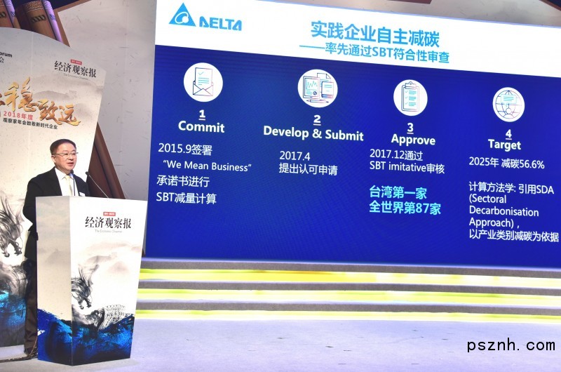臺達(dá)發(fā)言人暨企業(yè)永續(xù)發(fā)展部資深協(xié)理周志宏代表領(lǐng)獎,并以”綠色企業(yè) 永續(xù)發(fā)展”為題分享臺達(dá)經(jīng)驗。他表示,臺達(dá)深信要成為一家永續(xù)經(jīng)營的企業(yè),在追求營收成長的同時,更要重視企業(yè)社會責(zé)任,才能行穩(wěn)致遠(yuǎn)。臺達(dá)積極參與國際倡議減碳活動,扮演世界級企業(yè)公民,已連續(xù)12年參與聯(lián)合國氣候變化大會,今年更在波蘭舉行的COP24期間,邀約國際知名智庫主辦官方周邊會議、參與永續(xù)創(chuàng)新論壇(Sustainable Innovation Forum, SIF),和來自全球各地的意見領(lǐng)袖交流,創(chuàng)新科技如何帶來可持續(xù)發(fā)展。 為積極響應(yīng)“We Mean Business”企業(yè)自主承諾,臺達(dá)率先以科學(xué)化方法訂定減碳目標(biāo)(SBT),制定2025年碳密集度下降56.6%的目標(biāo),并通過科學(xué)基礎(chǔ)目標(biāo)倡議組織符合性審查,成為中國大陸及臺灣地區(qū)第一家、全世界第87家通過審核的企業(yè)。