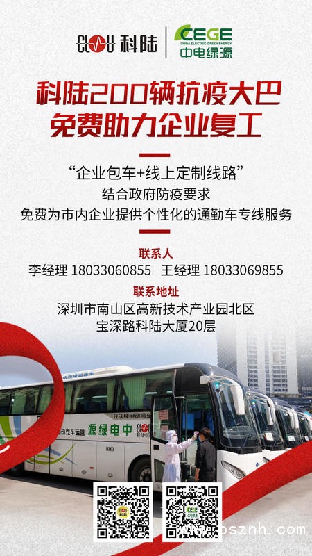 當(dāng)前全國疫情防控取得積極進(jìn)展,在企業(yè)復(fù)工復(fù)產(chǎn)過程中,員工上下班交通的交叉感染是防疫的薄弱環(huán)節(jié)。深圳市科陸電子科技股份有限公司旗下深圳市中電綠源純電動汽車運(yùn)營有限公司發(fā)揮自身優(yōu)勢,首批提供200輛免費抗疫大巴,為復(fù)工企業(yè)筑起安全墻。