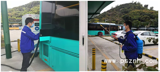 (左:工作人員正在為大巴充電,右:工作人員正在為充電場站進(jìn)行消殺)