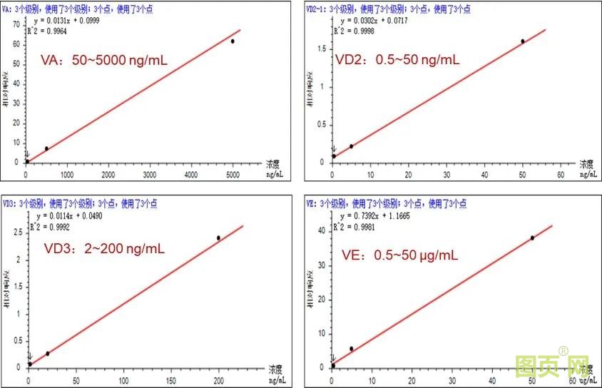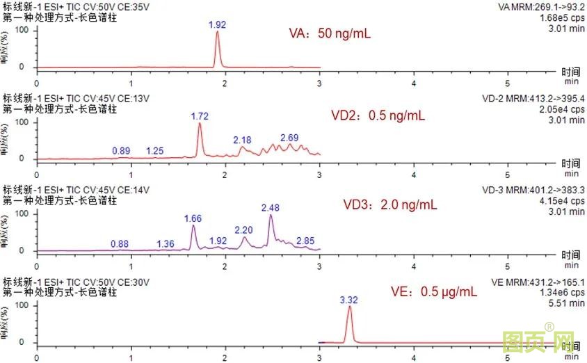 EXPEC 5210 針對維生素ADE的檢測采用梯度洗脫條件,在縮短分析時間的同時獲得了較好的去介質(zhì)及分離效果,一針進樣可得到VA、25-OH-VD2、25-OH-VD3、VE檢測結(jié)果,滿足臨床的高通量需求。同時在前處理過程中添加同位素內(nèi)標后,消除了不同基質(zhì)樣本中內(nèi)源性物質(zhì)對檢測物的影響,大大提高了檢測結(jié)果的準確性。