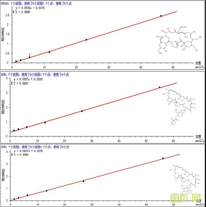 免疫抑制劑因其治療窗窄,在臨床應用中需進行治療藥物監(jiān)測,所測值作為臨床評價療效及毒副反應的指標。傳統(tǒng)免疫學方法進行血藥濃度監(jiān)測時特異性較差,不能完全區(qū)分免疫抑制劑與其代謝物;再者,其較大的分子量也加大了監(jiān)測難度。EXPEC 5210可實現(xiàn)3min內(nèi)完成3種免疫抑制劑——他克莫司、西羅莫司、依維莫司的濃度監(jiān)測,線性、重復性良好。