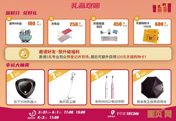 為了答謝小伙伴們一直以來的支持,記錄廣東泵閥展一路以來的成長,主辦方為大家準備了驚喜大禮,凡到場觀眾可憑積分兌換禮品,100積分可兌換美甲九件套,250積分可兌換充電寶,450積分可兌換折疊鍵盤或鼠標,600積分可兌換100元天貓購物卡!此外,現(xiàn)場還有一波幸運大抽獎,不為別的,只為觀眾福利到位,家用必備松下掃地機器人、美的吸塵器,口腔健康米狗MX602電動牙刷等,更好神秘好禮,等你今天來解鎖!通通免費送哦~