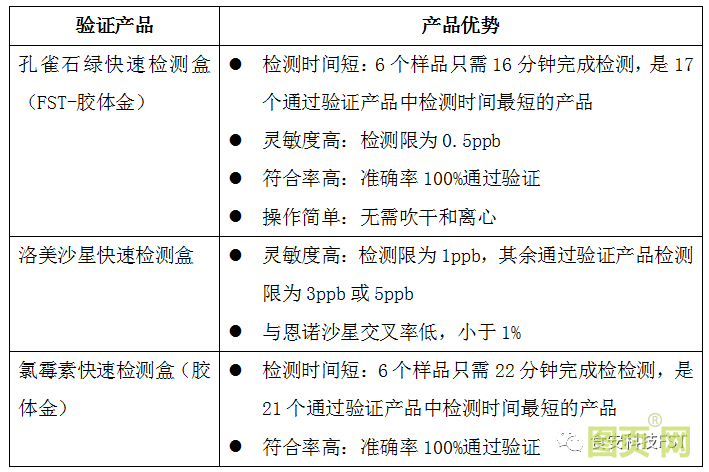 按照評(píng)價(jià)標(biāo)準(zhǔn),現(xiàn)場(chǎng)驗(yàn)證結(jié)果是食安科技參與驗(yàn)證的孔雀石綠快速檢測(cè)盒(FST-膠體金)、氯霉素快速檢測(cè)盒(膠體金)、呋喃唑酮代謝物快速檢測(cè)盒(膠體金)、呋喃西林代謝物快速檢測(cè)盒(膠體金)、洛美沙星快速檢測(cè)盒符合要求,通過了驗(yàn)證。