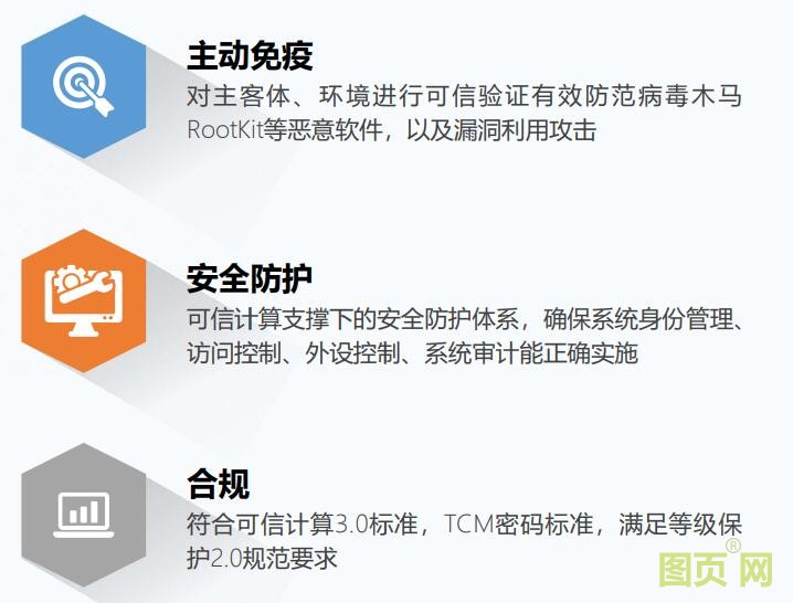 搭載國產(chǎn)X86架構的3230/3250 CPU,配合可信華泰可信計算3.0解決方案,滿足等保2.0標準中可信驗證的要求,具有高安全可控,高性能,通用性。