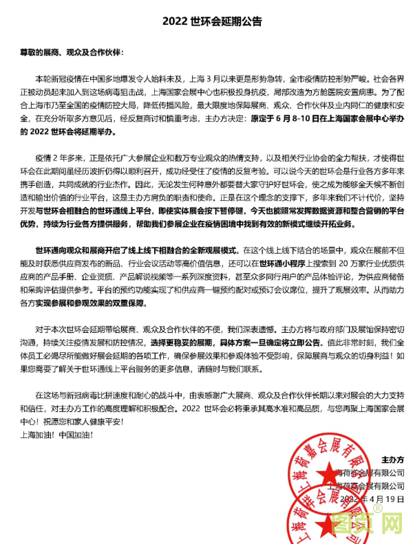 本輪新冠疫情在中國多地爆發(fā)令人始料未及,上海3月以來更是形勢急轉(zhuǎn),全市疫情防控形勢嚴峻。社會各界正被動員起來加入到這場病毒狙擊戰(zhàn),上海國家會展中心也積極投身抗疫,局部改造為方艙醫(yī)院安置病患。為了配合上海市乃至全國的疫情防控大局,降低傳播風險,最大限度地保障展商、觀眾、合作伙伴及業(yè)內(nèi)同仁的健康和安全,在充分聽取多方意見后,經(jīng)反復商討和慎重考慮,主辦方?jīng)Q定:原定于6月8-10日在上海國家會展中心舉辦的2022世環(huán)會將延期舉辦。