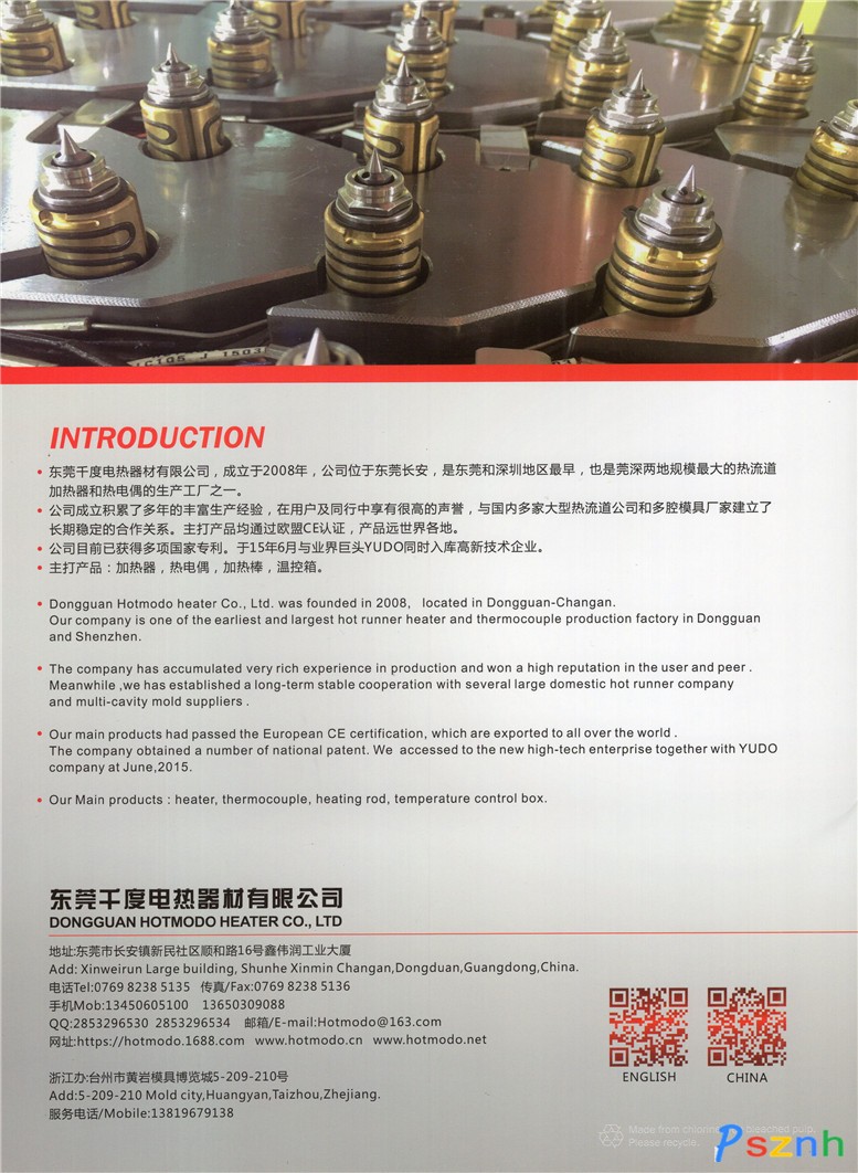 東莞千度電熱器材有限公司,成立于2008年,公司位于中國模具重鎮(zhèn)---東莞長安,是東莞和深圳地區(qū)最早,目前也是莞深兩地規(guī)模最大的熱流道加熱器和熱電偶的專業(yè)生產(chǎn)工廠。