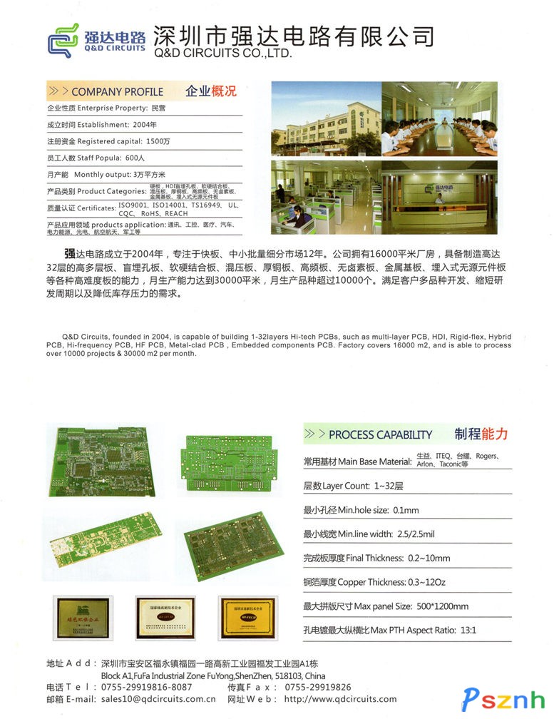 深圳市強達電路有限公司成立于2004年,是一家專業(yè)生產(chǎn)中小批量的快板和樣板企業(yè)。公司位于深圳市寶安區(qū)福永高新區(qū)福發(fā)工業(yè)園,擁有16000平米廠房,具備制造32層以下的高多層板、盲埋板、軟硬結(jié)合板、混壓板、厚銅板、高頻板、無鹵素板、金屬基板、埋入式無源元件板等各種高難度板的能力,月生產(chǎn)能力達到30000平米,月生產(chǎn)品種達8000個。