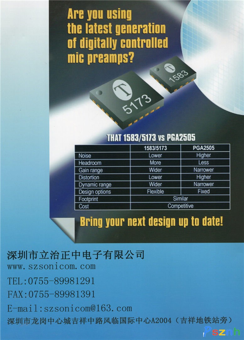 一、THAT源于著名的音響品牌dbx團(tuán)隊(duì),是美國(guó)著名的專(zhuān)業(yè)音頻集成電路制造商,始創(chuàng)于1989年,專(zhuān)著于模擬音頻小信號(hào)電路的研究,THAT的研究人員對(duì)音頻有獨(dú)特的理解和研究,他們質(zhì)疑人類(lèi)聽(tīng)覺(jué)最高頻率20KHz之上的音效資訊無(wú)用論的說(shuō)法,并發(fā)表一系列研究,說(shuō)明這些超音頻的重要性,他們認(rèn)為,只有將更多、更高頻率的音頻信號(hào)還原,才能正確體現(xiàn)原聲,故其產(chǎn)品帶寬一般都在2MHZ以上,部分甚至達(dá)到了20MHZ,THAT獨(dú)創(chuàng)的壓縮/解壓縮技術(shù)在模擬音效上的噪聲消除、失真改善、 增加頻率響應(yīng)等有顯著改善。 THAT最著名的產(chǎn)品是VCA(電壓控制放大器),其獨(dú)特的音頻壓縮、解壓縮技術(shù)可實(shí)現(xiàn)音頻的無(wú)損低失真壓縮,使音頻錄音的動(dòng)態(tài)擴(kuò)展,噪音改善得到及大的提升,VCA也應(yīng)用于各類(lèi)音頻前級(jí),可有效改善高峰值音頻的失真,保護(hù)后級(jí)設(shè)備。 2004年,THAT Corp發(fā)表適用于高級(jí)無(wú)線麥克風(fēng)的Analog Engine IC THAT4320產(chǎn)品,應(yīng)用于音頻無(wú)線傳輸?shù)膲嚎s、擴(kuò)展,抑噪,其動(dòng)態(tài)范圍、噪音及失真指標(biāo)目前暫無(wú)其他公司產(chǎn)品能超越。 THAT公司于2009年前后推出的THAT1570+THAT5171音頻前置放大器組合,將模擬音頻與數(shù)字電路完美結(jié)合,可實(shí)現(xiàn)話音放大增益的數(shù)字步進(jìn)式控制,可方便聯(lián)網(wǎng)控制音頻設(shè)備的開(kāi)關(guān)和增益控制,其噪音指標(biāo)達(dá)1 nV/√Hz input noise (60 dB gain),失真指標(biāo)達(dá) 0.0003%。