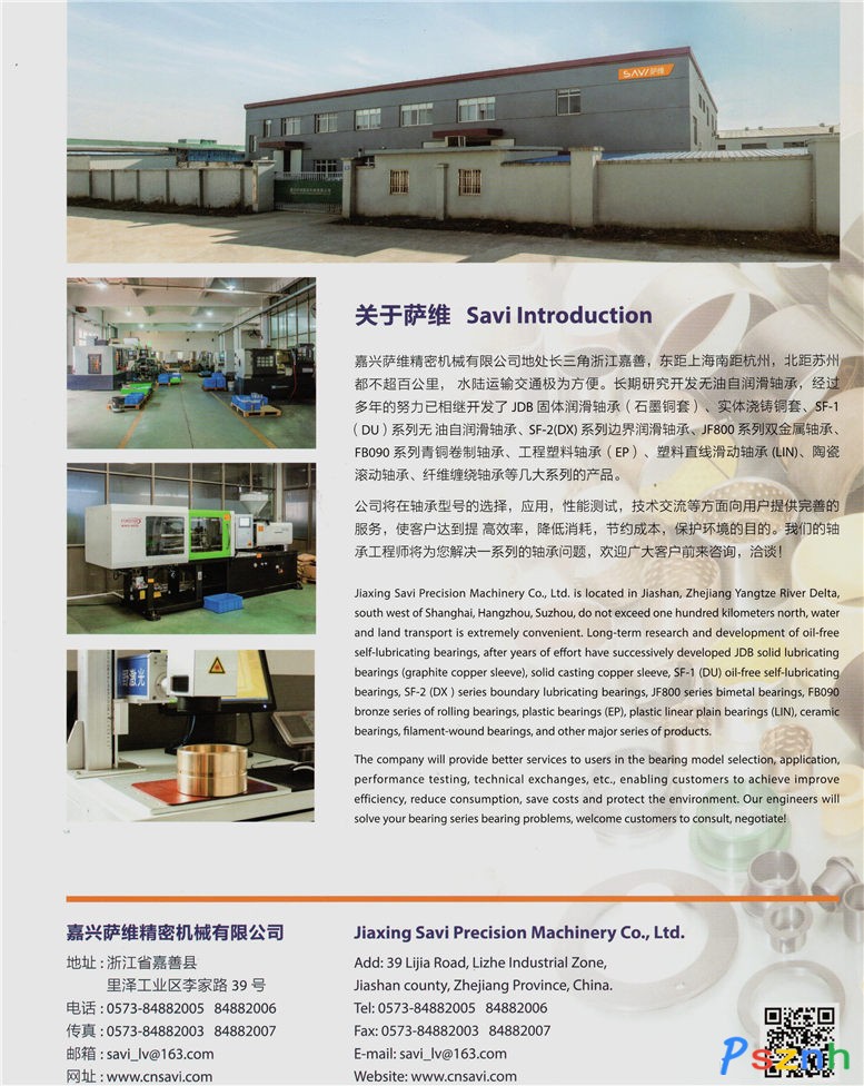 嘉興薩維精密機(jī)械有限公司地處長(zhǎng)三角浙江嘉善,東距上海南距杭州,北距蘇州都不超百公里,水陸運(yùn)輸交通極為方便。長(zhǎng)期研究開(kāi)發(fā)無(wú)油自潤(rùn)滑軸承,經(jīng)過(guò)多年的努力已相繼開(kāi)發(fā)了JDB固體潤(rùn)滑軸承(石墨銅套)、實(shí)體澆鑄銅套、SF-1(DU)系列無(wú)油自潤(rùn)滑軸承、SF-2(DX)系列邊界潤(rùn)滑軸承、JF800系列雙金屬軸承、FB090系列青銅卷制軸承、工程塑料軸承(EP)、塑料直線滑動(dòng)軸承(LIN)、陶瓷滾動(dòng)軸承、纖維纏繞軸承等幾大系列的產(chǎn)品。公司將在軸承型號(hào)的選擇,應(yīng)用,性能測(cè)試,技術(shù)交流等方面向用戶提供完善的服務(wù),使客戶達(dá)到提高效率,降低消耗,節(jié)約成本,保護(hù)環(huán)境的目的。我們的軸承工程師將為您解決一系列的軸承問(wèn)題,歡迎廣大客戶前來(lái)咨詢,洽談!