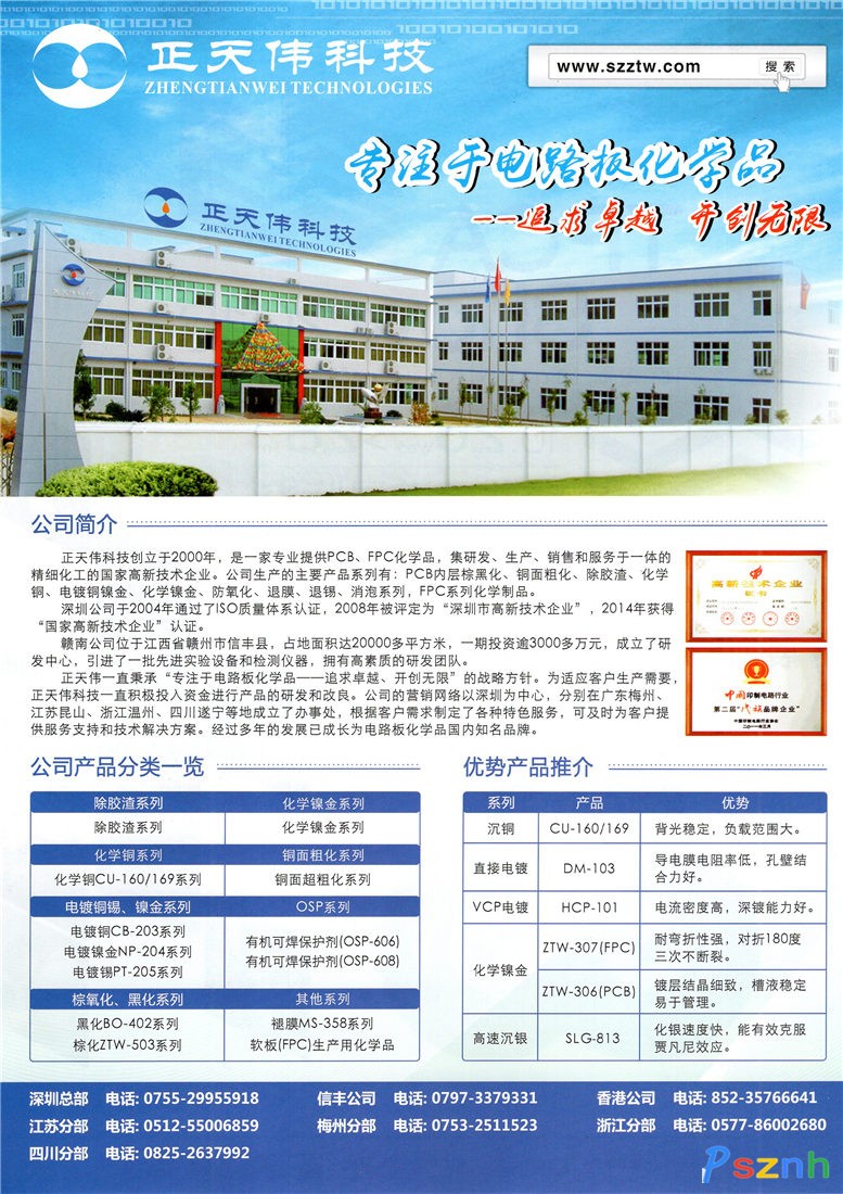 正天偉一直秉承“專注于電路板化學(xué)品------追求卓越、開創(chuàng)無限”的戰(zhàn) 略方針。為適應(yīng)客戶生產(chǎn)需要,正天偉科技一直積極投入資金進行產(chǎn)品的研發(fā) 和改良。公司的營銷網(wǎng)絡(luò)以深圳為中心,分別在廣東梅州、珠海、江蘇昆山、 浙江溫州成立了辦事處,根據(jù)客戶情況定制了各種特色服務(wù),可以及時為客戶 提供技術(shù)解決方案。經(jīng)過多年的發(fā)展已成長為線路板化學(xué)品國內(nèi)知名品牌。