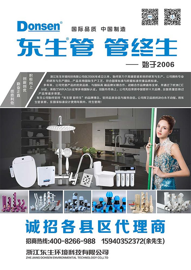 浙江東生環(huán)境科技有限公司引進先進三型共聚丙烯(PP-R)管材、管件生產設備,采用韓國進口曉星PPR原料生產,并配有專門檢測設備和技術人員,生產規(guī)格從20mm-160mm。公司生產的“東生”牌三型聚丙烯(PP-R)系列管材、管件是一種綠色、環(huán)保、健康的產品,憑借優(yōu)良的品質一投入市場就受到廣大用戶的好評。 公司PPR管材即有PPR管材,還有性能更優(yōu)異的PP-R玻纖高性能復合管、等壁厚塑鋁復合管,可以廣泛應用于應用在高端住宅冷熱水、直飲水、純凈水、賓館酒店冷熱水輸送、高溫散熱器管網等,總有一款適合您。