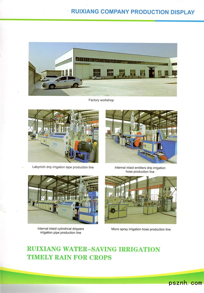 通過引進(jìn)國外的先進(jìn)技術(shù)和自主研發(fā)創(chuàng)新,公司主要的節(jié)水灌溉設(shè)備有:單雙層單翼迷宮式滴灌帶生產(chǎn)線、內(nèi)鑲貼片式滴灌帶生產(chǎn)線、內(nèi)鑲圓柱式滴灌管生產(chǎn)線、微噴帶/PE水帶(軟帶)生產(chǎn)線、PE/PVC塑料管材生產(chǎn)線。節(jié)水灌溉生產(chǎn)設(shè)備更是出口到俄羅斯、韓國、泰國、印度、烏克蘭、烏茲別克斯坦、古巴、墨西哥和澳大利亞等各國。